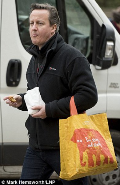 وقد تم مشاهدة رئيس الوزراء البريطاني ديفيد كاميرون يتمشى بعدما تسوق، وكان يحمل حقيبة مليئة بالبضائع ويمسك بيده كعكا يأكله وهو يتمشى.